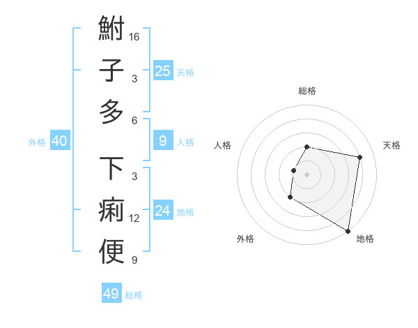 鮒子多 下痢便さんの総格は49画の2点!