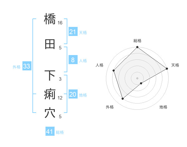 橋田 下痢穴さんを姓名の画数から五運を鑑定