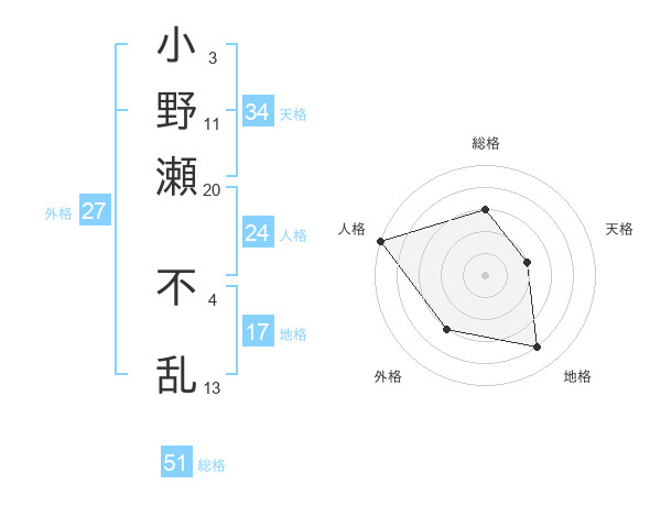 小野瀬 不乱さんを姓名の画数から五運を鑑定