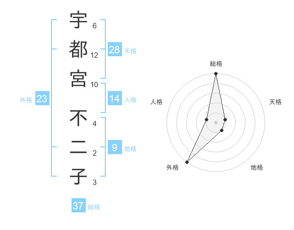 宇都宮 不二子さんの総格は37画の5点!