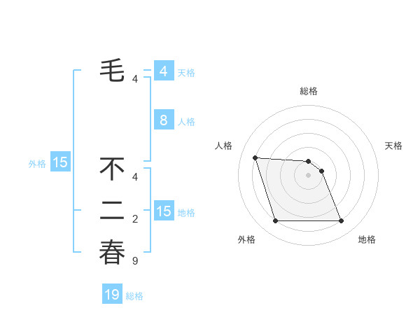 毛 不二春さんの外格は15画の4点!
