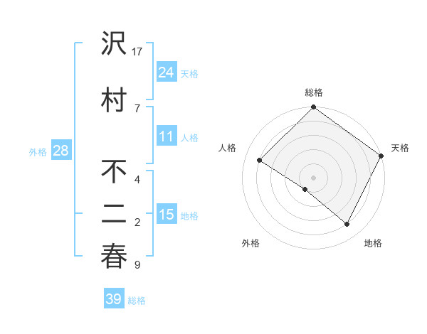 沢村 不二春さんの総格は39画の5点!