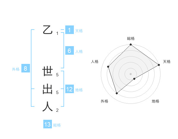 乙 世出人さんの総格は13画の5点!