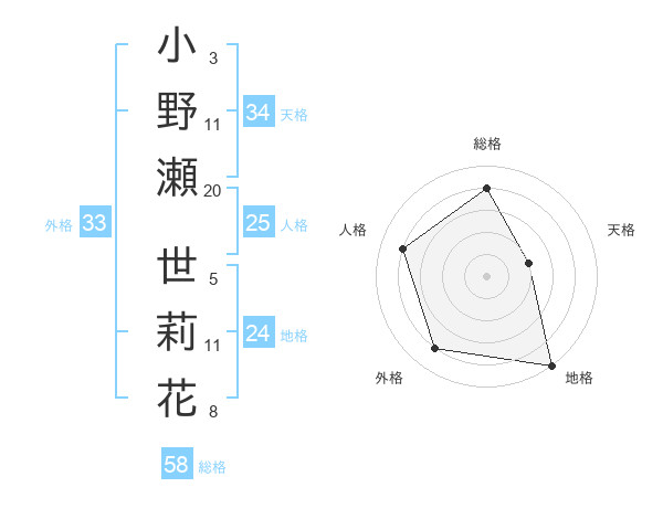 小野瀬 世莉花さんの総格は58画の4点!