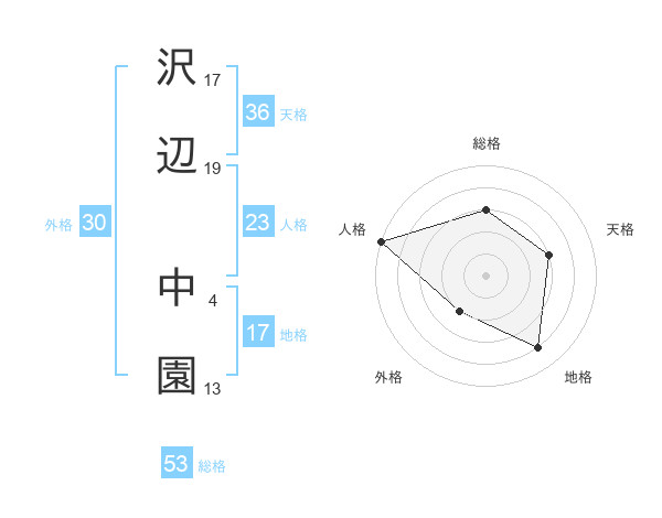 沢辺 中園さんの総格は53画の3点!