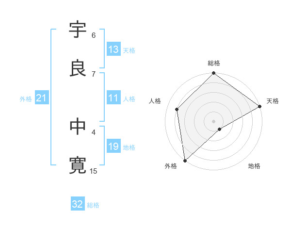 宇良 中寛さんの総格は32画の5点!