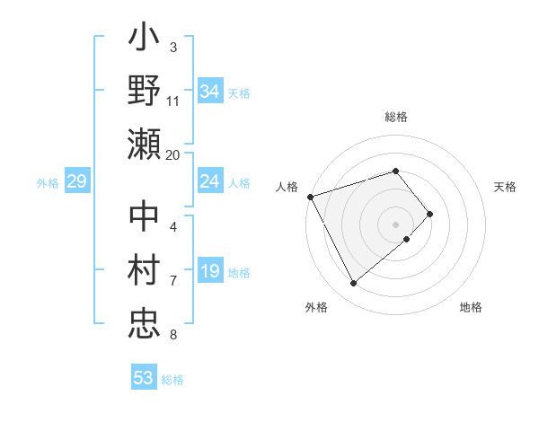 小野瀬 中村忠さんの総格は53画の3点!