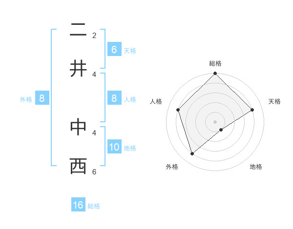 二井 中西さんの総格は16画の5点!