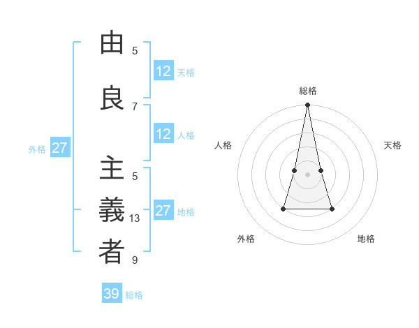 占い結果は姓名判断である以上、良い場合も悪い場合もありますが、決してお名前を誹謗中傷するものでなく、画数の自動計算によって得られたものです。また、本サイトの検索によって得られた鑑定結果で、第三者を誹謗中傷したり名誉を棄損するような行為を禁じます。