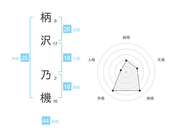 柄沢 乃機さんの総格は44画の2点!