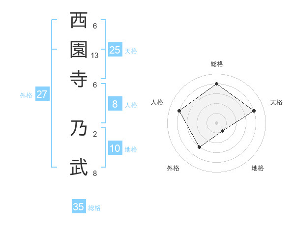 西園寺 乃武さんを姓名の画数から五運を鑑定