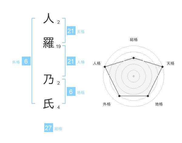 人羅 乃氏さんの天格は21画の5点!