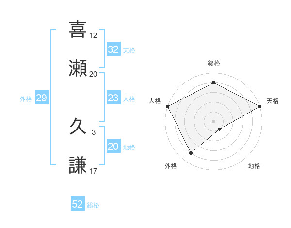 喜瀬 久謙さんの総格は52画の4点!