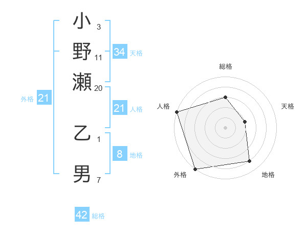 小野瀬 乙男さんの外格は21画の5点!