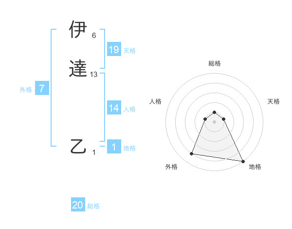 伊達 乙さんの総格は20画の1点!
