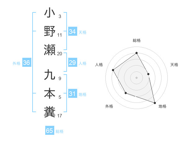 小野瀬 九本糞さんの総格は65画の4点!