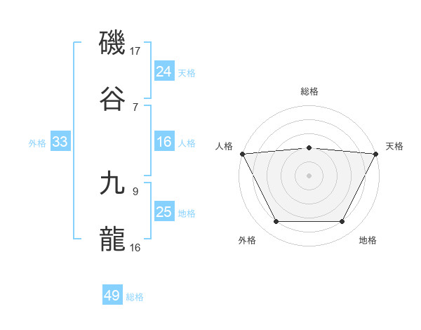 磯谷 九龍さんの総格は49画の2点!