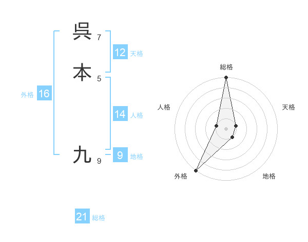 呉本 九さんの総格は21画の5点!