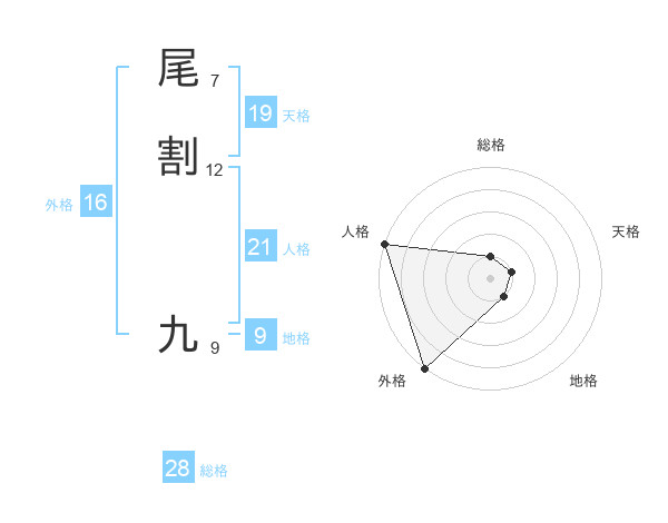 尾割 九さんの人格は21画の5点!