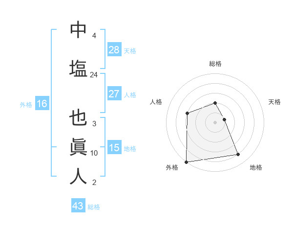 中塩 也眞人さんの総格は43画の2点!