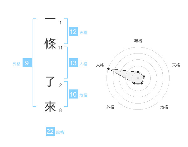 一條 了來さんの総格は22画の1点!