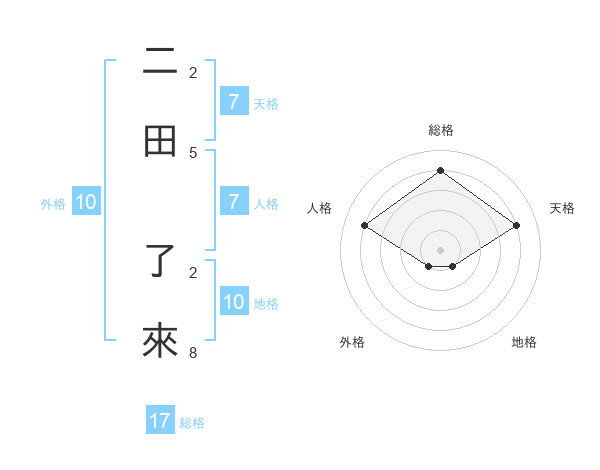 二田 了來さんの総格は17画の4点!