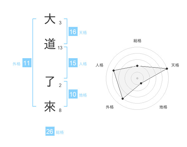 大道 了來さんの天格は16画の5点!