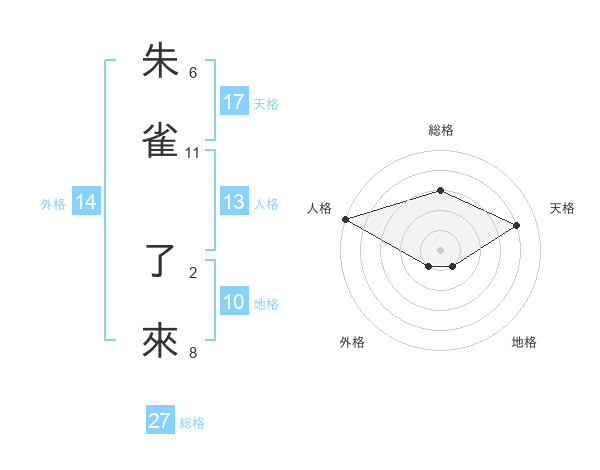 朱雀 了來さんの外格は14画の1点!