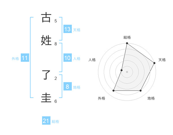 古姓 了圭さんの総格は21画の5点!