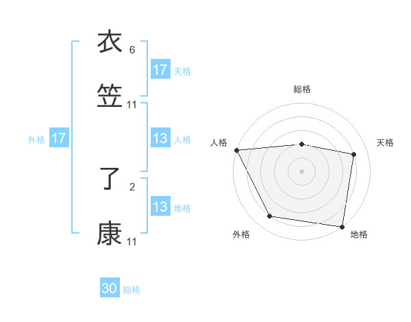 衣笠 了康さんを姓名の画数から五運を鑑定