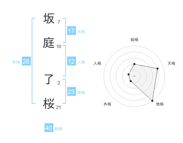 坂庭 了桜さんの地格は23画の5点!