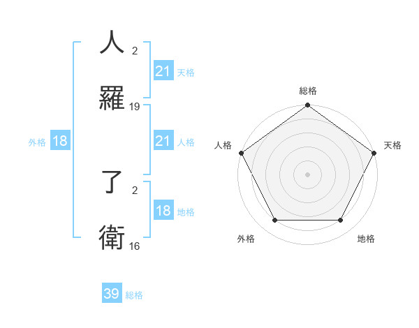 人羅 了衛さんの天格は21画の5点!