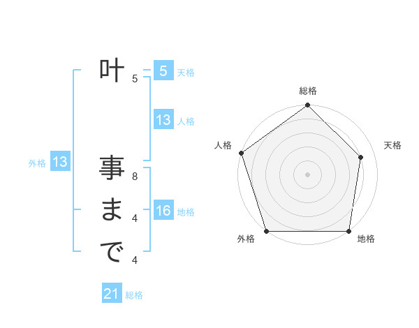 叶 事までさんの外格は13画の5点!