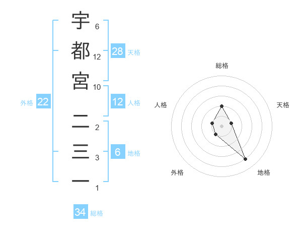 宇都宮 二三一さんを姓名の画数から五運を鑑定