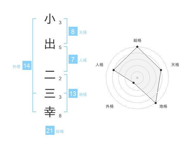 小出 二三幸さんの総格は21画の5点!