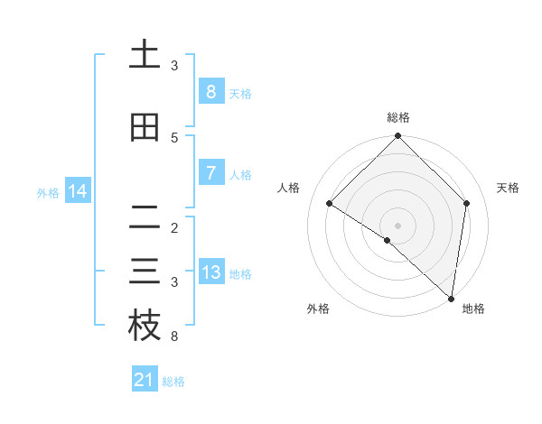 土田 二三枝さんの総格は21画の5点!