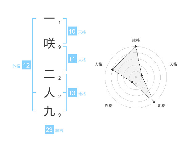 一咲 二人九さんを姓名の画数から五運を鑑定