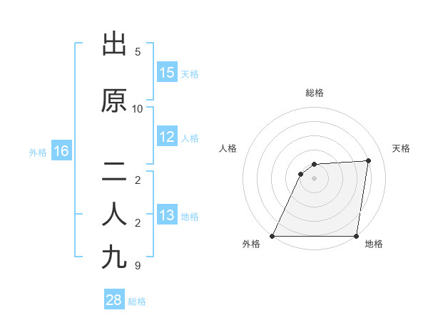 出原 二人九さんの総格は28画の1点!