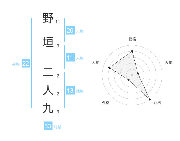 野垣 二人九さんを姓名の画数から五運を鑑定