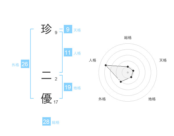珍 二優さんの総格は28画の1点!