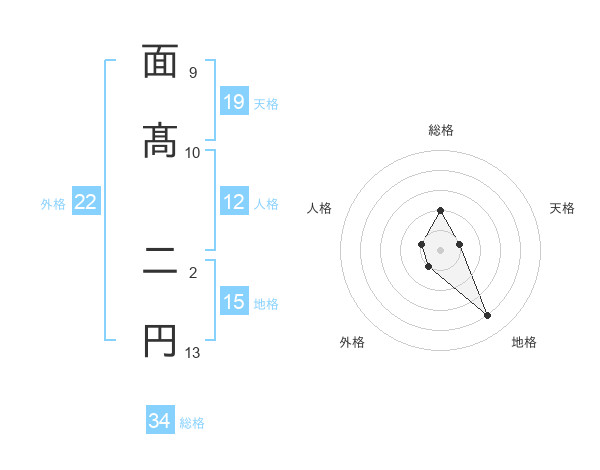 面髙 二円さんの総格は34画の2点!