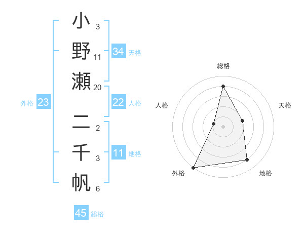 小野瀬 二千帆さんを姓名の画数から五運を鑑定