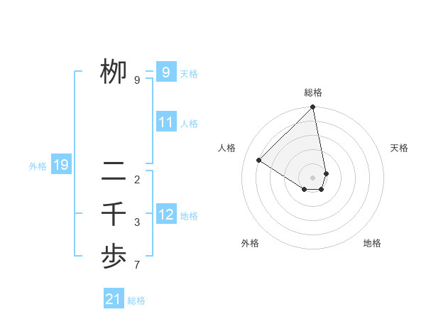 栁 二千歩さんを姓名の画数から五運を鑑定