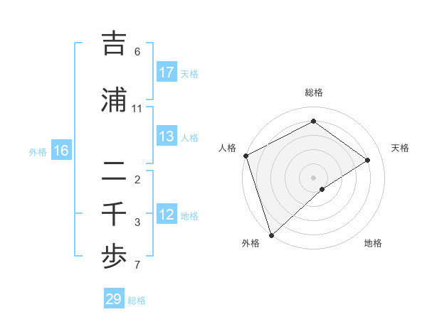 吉浦 二千歩さんを姓名の画数から五運を鑑定