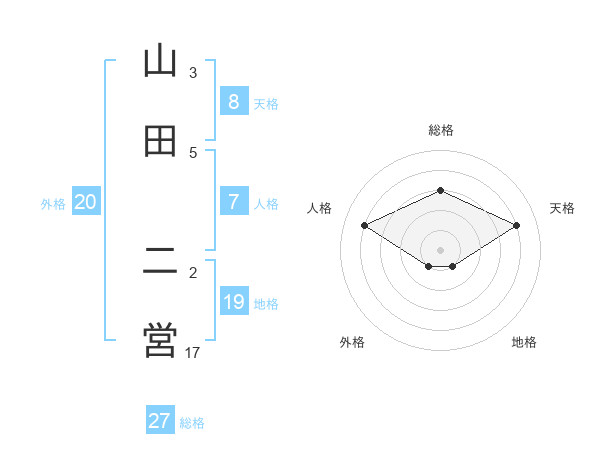 山田 二営さんの総格は27画の3点!