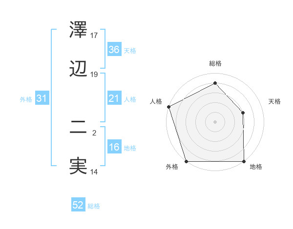 澤辺 二実さんの総格は52画の4点!