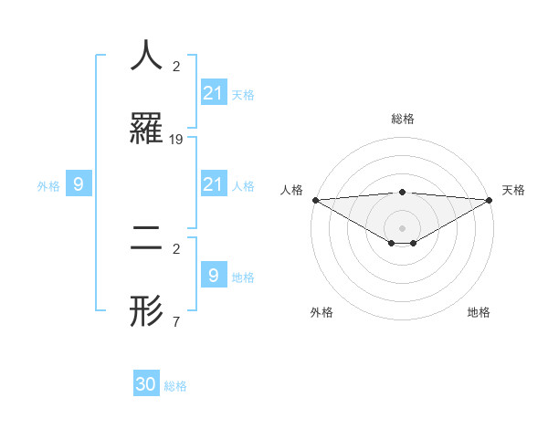 人羅 二形さんの総格は30画の2点!