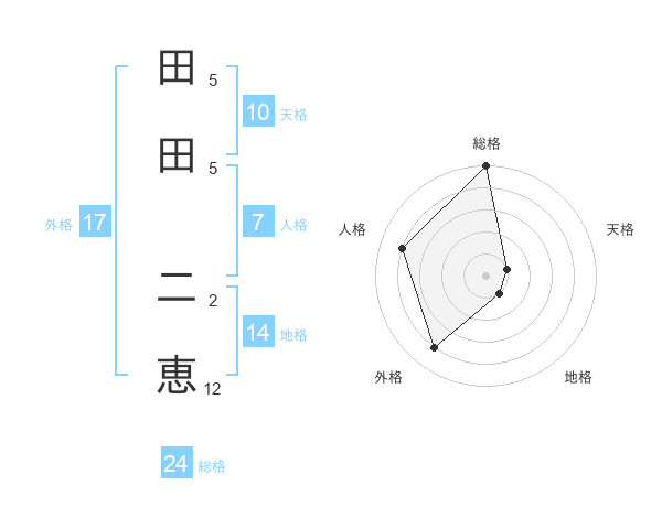 田田 二恵さんの総格は24画の5点!