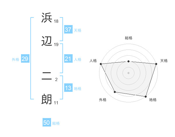 浜辺 二朗さんの総格は50画の2点!