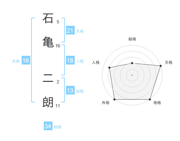 石亀 二朗さんの天格は21画の5点!